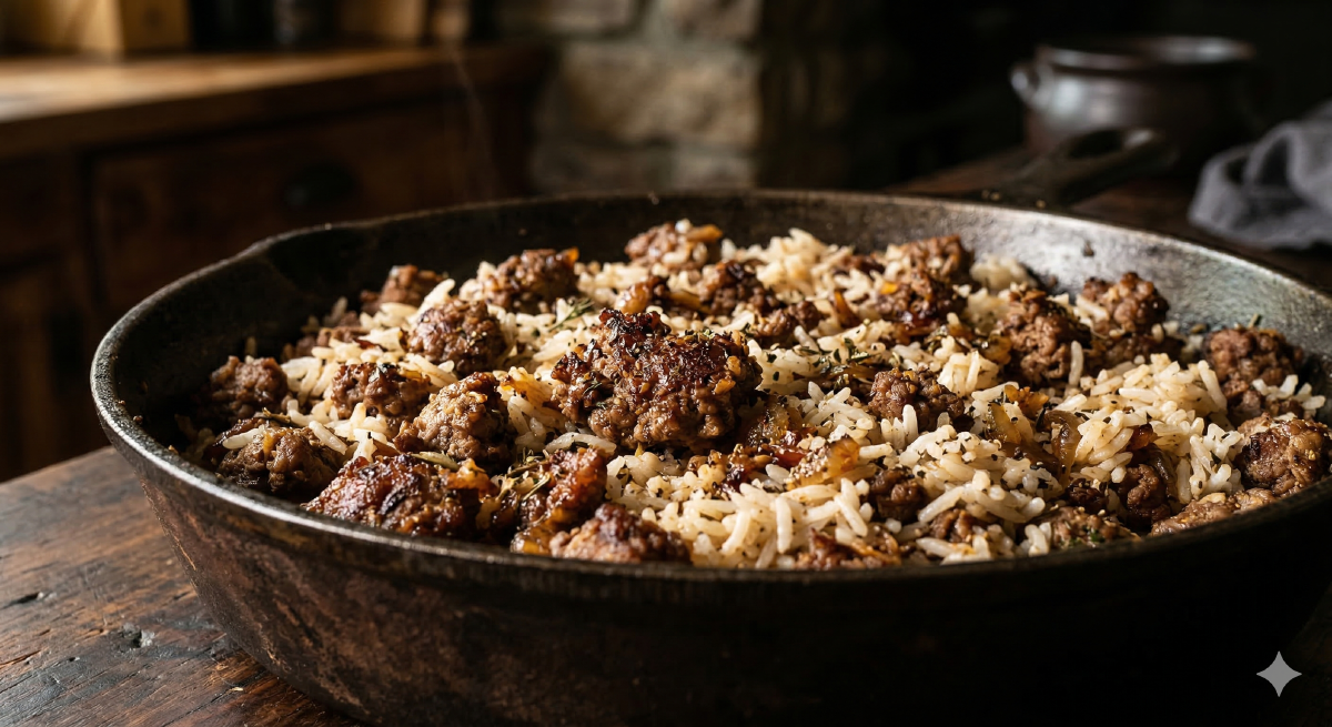 This is the second pillar of the weekly rotation. If chicken thighs are the workhorse, ground beef and rice is the tank. It is the cheapest protein-per-dollar you can get, it cooks in one pan in thirty minutes, and it reheats without any fuss. Four portions, five bucks, done.